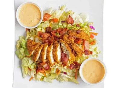 Salad blend with bacon, shredded cheddar, and tomato. Option to toss chicken in sauce for an additional charge, with dressing choice.