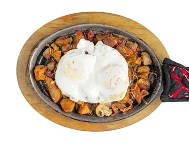 Bacon, sausage, ham, mushrooms, onions, peppers, and shredded cheese with 2 eggs on top, country potatoes, and toast.